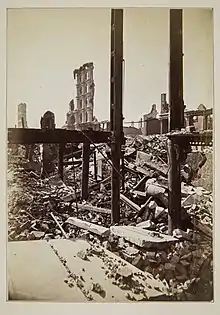 En , environ 10 km2[51] furent réduits en cendres par le Grand incendie de Chicago (Great Chicago Fire)[52]. Les pompiers de Chicago (Chicago Fire Department) n'ont reçu la première alerte qu'à 21h40 et de forts vents soufflaient depuis le sud-ouest, en direction du centre-ville. Très vite, le feu se propagea sur l'ensemble du centre-ville et vers le nord. Le bilan fut dramatique puisque 300 personnes trouvèrent la mort, plusieurs milliers furent blessées et environ 100 000 personnes se retrouvèrent sans abris (1/3 des habitants de la ville)[53]. Ce qui favorisa la progression de l'incendie fut le grand nombre d'habitations construites en bois qui se mêlaient aux constructions plus solides mais également dotées d'éléments en bois. Les bâtiments se touchaient comme dans une ville européenne du Moyen Âge. Les flammes sautèrent de toiture en toiture et l'incendie fut si intense que même la rivière Chicago, pourtant large, eut du mal à servir de barrière de protection. La Pumping Station et la Water Tower, toutes deux conçues en pierre par l'architecte William W. Boyington, ainsi que l'église Saint-Michel et l'église de la Sainte-Famille firent partie des rares bâtiments qui survécurent à la catastrophe. Ce n'était pas la première fois qu'une ville importante subissait un sinistre d'une telle ampleur. En 1666, Londres fut frappée par un incendie qui détruisit la ville à 80 %[54]. Dans son histoire, New York dut faire face à sept incendies dont deux majeurs : en 1776 et 1835. Le , ce sont 27 hectares de Boston qui sont détruits par les flammes[55]. Cependant, ce dernier ne marqua pas autant les esprits que l'incendie de Chicago.