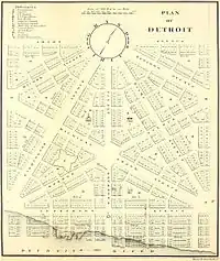 En 1805, Détroit a subi un incendie dévastateur, qui a détruit la majeure partie de l'architecture coloniale française de la ville. Peu après, le père Gabriel Richard a dit, meliora de Speramus ; cineribus de resurget nous espérons de meilleures choses ; elle ressuscitera de ses cendres ») qui sont devenues la devise officielle de la ville. Le juge Augustus B. Woodward a conçu un plan semblable à la conception de Pierre Charles L'Enfant de la ville de Washington.