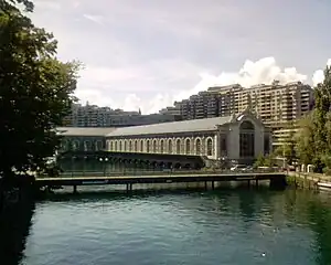Sur le plan économique, l'industrialisation de la région évolue, avec l'apparition d'ateliers de mécanique, d'appareillages électriques et d'automobiles, alors que l'électrification de la cité se fait sous l'impulsion du conseiller administratif Théodore Turrettini avec la construction des usines des Forces motrices et de Chèvres[68]. L'extension de la zone franche instaurée avec la restauration de 1813 contribue aux échanges régionaux. Genève devient également l'une des places fortes de l'Internationale, qui y tient un congrès en 1866, et deux grèves importantes, en 1868 et 1902, contribuent à l'amélioration des conditions de travail des ouvriers[69]. En 1882, le radical Georges Favon instaure les tribunaux de prud'hommes alors que, dix ans plus tard, l'introduction du scrutin proportionnel permet l'apparition du Parti socialiste et l'élection du premier socialiste comme membre d'un exécutif cantonal suisse : Fritz Thiébaud[70].
