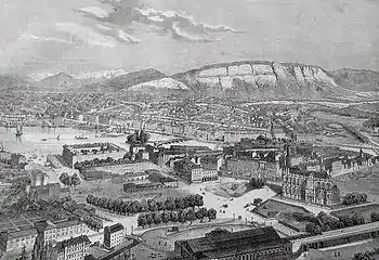 La révolution fazyste se traduit également par la destruction des fortifications qui enserrent la cité et freinent sa croissance démographique. Entreprise dès la fin 1849, cette destruction voit la ville se doter de grands boulevards, de quartiers résidentiels (Tranchées, Pâquis, etc.), d'édifices publics (Grand Théâtre, musée d'art et d'histoire, édifices religieux, etc.) et de nombreux bâtiments scolaires[66]. La disparition de l'enceinte s'accompagne de transformations à l'intérieur de l'ancienne agglomération percée de nouvelles rues et boulevards (ceinture fazyste) et agrémentée de quelques promenades. Le chantier, qui sert également à juguler la crise économique en employant de nombreux chômeurs[66], permet aussi de dégager l'espace nécessaire à l'édification de la première ligne de chemin de fer en 1858 (14 ans après la première ligne suisse). Les projets de tunnel sous le col de la Faucille et d'un port fluvial n'aboutiront pas.