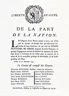 Durant cette même période, la France et la Sardaigne fondent les villes de Versoix et Carouge pour tenter de concurrencer Genève[49]. La fin de la haute conjoncture économique entre 1785 et 1789, conséquence de la crise générale qui marque la période précédant la Révolution française, frappe la population par une hausse des prix mais aussi les petits patrons. Le , le gouvernement genevois augmente le prix du pain à la suite d'une mauvaise récolte. Cette décision déclenche une émeute à Saint-Gervais qui conduit, en réaction, à l'annulation de la hausse et à la libéralisation progressive de la constitution. Après la Révolution française, l'encerclement de Genève par les révolutionnaires a pour résultat, en décembre 1792, un mouvement qui abat le gouvernement de l'Ancien Régime le 28 décembre et proclame l'égalité politique de toutes les catégories de la population[50]. En 1793, l'Ancien Régime prend fin à Genève : une constitution, rédigée par une assemblée nationale et votée par les citoyens le , institue un contrôle étendu de la part des citoyens sur les actes du gouvernement et de l'administration[51]. Cependant, elle réserve la citoyenneté aux seuls hommes protestants. En juillet, des clubs extrémistes composés d'artisans et de petits commerçants, redoutant un complot contre-révolutionnaire et le rejet d'une loi qui doit créer un impôt destiné à financer les occasions de travail, lancent une insurrection. Un tribunal révolutionnaire est constitué et condamne à mort 37 personnes — aristocrates mais aussi gens du peuple soupçonnés de pactiser avec l'aristocratie — mais seules onze d'entre elles sont exécutées[52].