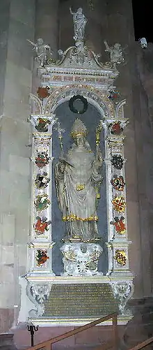 Sous Charlemagne, les Carolingiens atteignirent leur apogée. Charlemagne fit ériger à proximité de Mayence, à Ingelheim, l'une de ses résidences impériales[3]. La découverte d'un fragment de trône datant de la seconde moitié du VIIIe siècle laisse supposer qu'un palais impérial existait également à Mayence même. Charlemagne tint plusieurs assemblées à Mayence, ce qui devint une tradition suivie durant plusieurs siècles ; elles culminèrent en 1184, sous le règne de l'empereur Frédéric Barberousse. Mayence s'offrit comme lieu d'assemblée, étant donné qu'elle disposait déjà d'une vaste église (75 mètres de long), l'abbaye de Saint-Alban, dans laquelle les assemblées pouvaient prendre place, et qui se développa au cours des 200 ans suivants pour devenir le centre spirituel du diocèse. Comme la christianisation des Slaves et des autres peuples de l'Est par Mayence avançait rapidement, la ville devint un nœud de communication important de l'Empire, non seulement en ce qui concerne la politique et la religion, mais également pour l'économie. En particulier, les marchands rendirent la ville prospère. Le développement principal concernait toutefois le domaine de la religion, conduite par les archevêques successifs. Parmi les successeurs immédiats de Lullus, l'un des plus importants fut Raban Maur, qui devint évêque en 847 et sous lequel le développement de Mayence connut un premier point culminant en tant que centre spirituel significatif.