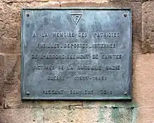 Durant la Seconde Guerre mondiale Saintes est occupée par les Allemands, qui pénètrent dans la ville le 23 juin 1940[68]. Une partie du quartier de la gare est détruit lors du bombardement du 24 juin 1944 : 250 maisons sont touchées et l'on compte 300 morts[69]. La reconstruction de la ville s'étale jusqu'en décembre 1956[68]. Lors de leur retrait de la ville, les Allemands avaient disposé des charges explosives au pont Bernard-Palissy et au pont ferroviaire de Diconche. Une plaque commémorative apposée à l'angle du pont Bernard-Palissy rappelle l'opération de déminage réalisée par deux groupes de résistants dans la nuit du 29 au 30 août 1944.