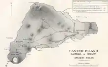 - avant les changements de population postérieurs à 1861, la tradition orale matamua rapporte que le nom de l’île était Haumaka ou plus exactement Te kainga a Hau Maka (le bout de terre de Hau Maka, également connu comme Hau Mata, Hao Matuha ou Hotu Matu’a)[9] ; Alfred Métraux donne aussi Hiti-ai-Rangi, Hanga-Oaro et Hanga-Roa, nom conservé jusqu’à nos jours par la capitale de l’île[10] ;