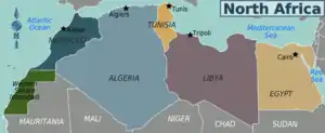 L'Afrique du Nord est une bande de terre relativement mince entre le désert du Sahara et la Méditerranée, s'étendant de la côte atlantique marocaine à l'Égypte. Actuellement, la région comprend cinq pays, d'ouest en est: le Maroc, l'Algérie, la Tunisie, la Libye et l’Égypte[1]. La région a été influencée par de nombreuses cultures diverses. Le développement de la navigation maritime a fermement fait entrer la région dans le monde méditerranéen, surtout à l'époque classique. Au 1er millénaire de notre ère, le Sahara est devenu une zone de commerce tout aussi importante car les caravanes de chameaux apportaient des marchandises et des personnes du sud. La région a également un lien terrestre petit mais crucial avec le Moyen-Orient, et cette région a également joué un rôle clé dans l'histoire de l'Afrique du Nord.