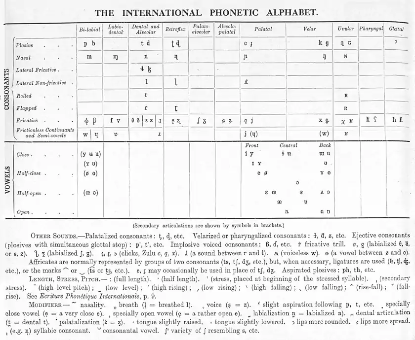 - (en) International Phonetic Association, « The Association’s Alphabet », Journal of the International Phonetic Association, vol. 6, no 1, , p. 2–3 (DOI 10.1017/S0025100300001420)
