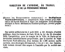 Des pratiques utilisées dans les colonies sont importées en métropole. Une commission administrative installe un système de surveillance identifiant, ainsi que des dispensaires. Elle se charge aussi d'installer des foyers de travailleurs migrants[7], qui hébergent en majorité des Kabyles. La municipalité parisienne soutient la création de foyers privés, en 1931, à Colombes et à Gennevilliers : c'est la « régie des foyers ouvriers nord-africains », dirigée par le secrétaire général de l'Institut musulman[7]. Une telle politique du logement, consacrée aux travailleurs immigrés et développée après 1945 avec l'institution de la SONACOTRA, demeure une spécificité française[7].