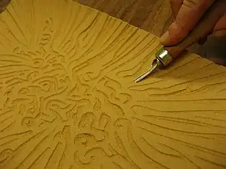 Les xylographes gravent avec des outils divers une image désirée en plusieurs copies. De ce fait, lorsque l'encre est tamponnée sur le relief du bois, ils créent une image après application sur le papier[4].
