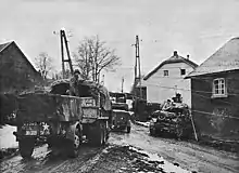 Après quelques mois de calme relatif en Belgique, le , les Allemands lancèrent l'Offensive des Ardennes jetant un quart de million de soldats dans la bataille[95]. La reprise d'Anvers était l'objectif final de l'assaut mais l'avancée ennemie fut contenue sur la Meuse, à Celles près de Dinant. Cette attaque est finalement repoussée par les troupes américaines, britanniques et belges après six semaines d'âpres combats dans des conditions hivernales sévères[95]. De nombreux civils souffrirent durant cette offensive et virent leur village réduit à l'état de ruine. Les Allemands passèrent par les armes de nombreux civils[96]. 90 % du village de La Roche-en-Ardenne furent détruits durant les combats[97].