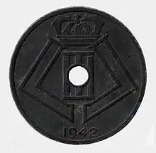 Le roi resta en Belgique durant la guerre en tant que prisonnier des Allemands tandis que le gouvernement s'exilait et continua de soutenir l'action militaire des alliés[30]. À l'inverse, des Pays-Bas ou du Luxembourg où la monarchie fut réprimée ou regagna son gouvernement en exil, Léopold III resta en place, battit monnaie de son monogramme, durant toute l'occupation[31]. Jamais cependant, il ne fut la cible de la résistance, cet état de fait expliqué par le slogan : « La Belgique est captive ! Longue vie à la Belgique ! Le roi est captif ! Longue vie au roi[32] ! »