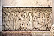 La frise se trouve placée aujourd’hui sur deux niveaux différents. Cette disposition n’est certainement pas celle d’origine : les quatre plaques devaient être sur le même axe horizontal mais les deux des extrémités ont probablement été rehaussées au XIIe par les Maestri campionesi lorsqu’ils ouvrirent les deux portes latérales de la façade.