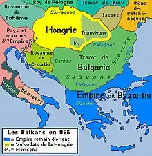 En 895, la confédération des tribus magyares se fixe définitivement sur le moyen-Danube, dans le bassin des Carpates, où elles rencontrent des Slaves (la principauté du Balaton de Pribina et de son fils Kocel’, le royaume de la Grande-Moravie), des peuples turcs (par exemple Avars entre Danube et Tisza), des valaques (le long des Carpates) et des Iasses, peuple iranien proche des Ossètes du Caucase).
