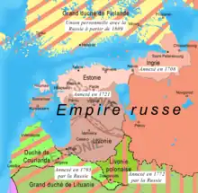 En 1721, au terme de la grande guerre du Nord, le tsar Pierre Ier le Grand s'empare de la ville hanséatique de Riga et du duché de Livonie suédois (traité de Nystad) afin d'avoir un accès maritime permanent vers l'Europe. Puis la Russie prend possession des provinces restées polonaises au cours du XVIIIe siècle.
