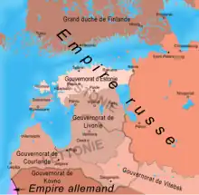 La Courlande (Kurzeme), annexée par la Russie à la suite du troisième partage de la Pologne (1795), est regroupée avec l'Estlande et la Livonie dans un ensemble baptisé du mot allemand de Baltikum qui est dirigé à compter de 1801 par un gouverneur russe unique installé à Tallinn[N 3]
