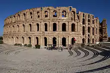 Parmi les autres productions figurent les céramiques et les produits dérivés du poisson. La province se couvre d'un dense réseau de cités romanisées dont les vestiges encore visibles à l'heure actuelle demeurent impressionnants : il suffit de mentionner les sites de Dougga (antique Thugga), Sbeïtla (Sufetula), Bulla Regia, El Jem (Thysdrus) ou Thuburbo Majus. Parmi les symboles de la richesse provinciale se trouvent l'amphithéâtre de Thysdrus, l'un des plus grands du monde romain, et le théâtre de Dougga. À côté des vestiges des bâtiments publics resurgissent de riches habitations privées, villas au sol couvert de mosaïques que la terre du pays ne cesse de restituer aux archéologues. Partie intégrante de la République puis de l'empire avec la Numidie[35], la Tunisie devient pendant six siècles le siège d'une civilisation romano-africaine d'une exceptionnelle richesse, fidèle à sa vocation de « carrefour du monde antique ». La Tunisie est alors le creuset de l'art de la mosaïque, qui s'y distingue par son originalité et ses innovations[43]. Sur les stèles à caractère religieux on distingue d'anciens symboles tels le croissant lunaire ou le signe de Tanit. Concurrents des dieux romains, des dieux indigènes apparaissent sur des frises d'époque impériale, et le culte de certaines divinités, Saturne et Caelestis, s'inscrit dans la continuité du culte voué par les Puniques à Ba'al Hammon et à Tanit sa parèdre[46]. Le « carrefour du monde antique » voit aussi l'installation précoce de communautés juives[42] et, dans le sillage de celles-ci, des premières communautés chrétiennes. La langue punique elle-même reste longtemps en usage, fortement jusqu'au Ier siècle, et elle est attestée dans une moindre mesure jusqu'à l'époque de saint Augustin[47].