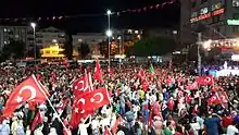 Le , une tentative de coup d'État militaire menace le pouvoir d'Erdoğan. Celui-ci appelle le peuple à braver le couvre-feu. La tentative de coup d’État est avortée. Elle aura fait au moins 346 morts dont 104 putschistes abattus, et plus de 1 440 blessés. Environ 2 839 membres des forces armées sont arrêtés dans un premier temps. Des purges massives s'ensuivront. Entre le et le , plus de 110 000 militaires, fonctionnaires, magistrats, enseignants et policiers sont révoqués et 36 000 personnes incarcérées doivent d'être jugées pour leur implication présumée dans la tentative de coup d’État[39]. C'est le monde de l'enseignement qui est le plus touché par la purge avec la suspension de 21 738[40],[41] fonctionnaires du ministère de l'Éducation et avec l'appel du Conseil de l'enseignement supérieur à la démission de 1 577 recteurs et doyens des universités[42]. Au total, 1,5 % des fonctionnaires du ministère de l'Éducation seront suspendus. Le monde de la justice n'est pas épargné puisque quelques heures après la tentative de coup d'État, le Conseil supérieur de la magistrature turc (HSYK) démet 2 745 juges de leurs fonctions en attendant leurs jugements[43], tandis que 700 d'entre eux sont arrêtés[44]. Le régime procède également à la mise au pas des médias : entre le et le , 170 organes de presse ont été fermés, 105 journalistes placés en détention et 777 cartes de presse annulées[45].