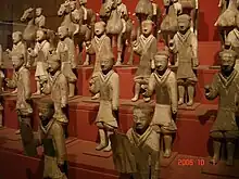 L'État de Qin est créé par la dynastie Zhou (v. 1050-256 av. J.-C.) dans le double but de servir d'avant-poste consacré à l'élevage des chevaux et d'être un État tampon défensif contre les armées des peuples nomades Rong, Qiang et Di[1]. Après la conquête en 221 av. J.-C. des six autres royaumes combattants[1],[note 5], Ying Zheng, le roi de Qin, unifie la Chine en un empire centralisé divisé en 36 commanderies[2]. Ayant pris le contrôle d'une grande partie de la Chine historique, il affirme son prestige en prenant le titre de Huangdi (皇帝), ou « empereur », qu'il crée pour l'occasion et change son nom en Qin Shi Huang, ce qui signifie "premier empereur de Qin"[2]. Selon les historiens de l’époque Han, il utilise des méthodes impitoyables pour conserver le pouvoir[3].