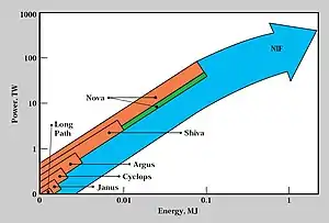 En 1972, John Nuckolls exposait l'idée d'un « allumage de fusion »[39], selon le principe d'une réaction en chaîne : l'hélium chaud produit lors de la fusion réchauffe le combustible et déclenche d'autres réactions. Suite à l'article de Nuckolls, un effort de développement important s'est mis en place. Le LLNL se mit à construire des systèmes laser, parmi lesquels : Argus, Cyclops, Janus, Long Path (laser à verre dopé au néodyme), le laser Shiva et le laser Nova à 10 faisceaux en 1984. Nova produira finalement 120 kilojoules de lumière infrarouge au cours d'une impulsion de l'ordre de la nanoseconde.