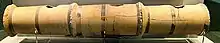« Suivant le morceau de tube de 0,85 m de long trouvé...la jonction latérale était placée en dessus, ce qui permettait une étanchéité jusqu'au remplissage maximum du tube. La pente de la canalisation était faible mais régulière, environ 1,5 %, qui correspond approximativement à une pente de 1 pouce pour une aune égyptienne...» [20]. Par rapport au système métrique, 1 doigt = 1,89 cm et 1 aune égyptienne = 5 m environ[21]. »