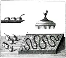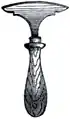Les fleurons sont régulièrement gravés dans du cuivre, et en relief pour que le motif apparaisse en creux sur le cuir (contrairement à la plupart des fers au Moyen Âge, qui étaient gravés en creux pour un motif apparaissant en relief sur le support)[110]. La « palette », un fer orné et emmanché, de forme légèrement convexe, est inventée à la Renaissance pour permettre au relieur-doreur d'ajouter des frises décoratives sur le dos, par un mouvement de balancier[111]. Elles viennent ainsi compléter les roulettes ornées, difficilement utilisables sur une surface arrondie[111].