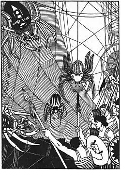 - (en) « appointed to spin a web in the air between the Moon and the Morning Star, which was done in an instant, and made a plain campaign upon which the foot forces were planted... »