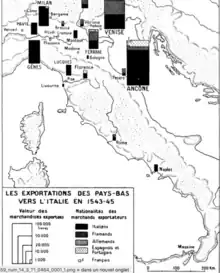 - Wilfrid Brulez, « L'Exportation des Pays-Bas vers l'Italie par voie de terre, au milieu du XVIe siècle », Annales, vol. 14, no 3, , p. 461–491 (DOI 10.3406/ahess.1959.2845, lire en ligne, consulté le )