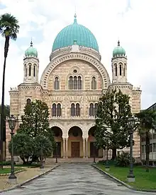 Des Juifs participent au soulèvement de 1848. L'égalité complète est accordée aux Juifs par la promulgation par le grand-duc Léopold II (grand-duc de Toscane) du Statuto le 6 mai 1848[20]. Avec l'unification de l'Italie, la communauté juive connait une émancipation totale et c'est alors qu'elle vit sa période la plus somptueuse. Florence occupe le rôle de capitale culturelle, et brièvement aussi civile, du nouvel État. Entre 1881 et 1898, pendant le Risanamento, l'ancien ghetto, déjà abandonné et profondément dégradé[21], est rasé et remplacé par la place de la République. En 1882, avec l'aide d'architectes chrétiens, la nouvelle synagogue est inaugurée, un des exemples les plus majestueux de synagogue en Italie, pendant qu'est édifiée la nouvelle façade de la basilique Santa Croce conçue par l'architecte juif Niccolò Matas.