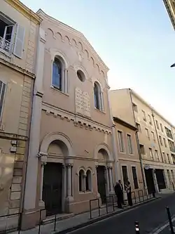Une synagogue, probablement une des premières à Nîmes, existe avant l'expulsion des Juifs en 1306. Germer-Durand en 1874 dans le Cartulaire du chapitre de l'église cathédrale Notre-Dame de Nîmes[27] et plus tard en 1886 Joseph Simon dans son Histoire des Juifs de Nîmes, la situent rue du Chapitre, à l'emplacement actuel de l'hôtel de la Prévôté. D'après Germer-Durand, la rue adjacente s'appelait à l'époque rue de la synagogue avant de prendre le nom de rue du Camp-nau supérieur et actuellement rue du Chapitre. Elle est confisquée par le pouvoir royal qui le , ordonne par mandatement aux surintendants dans l'affaire des Juifs et aux sénéchaux de mettre en vente les immeubles saisis.