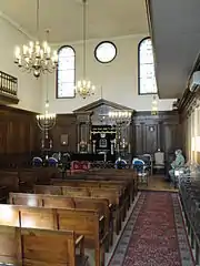 La salle de prière lambrissée au premier étage, montre l'influence des synagogues du Comtat Venaissin. De forme rectangulaire, elle comporte, sur trois de ses côtés, une galerie réservée aux femmes, en bois et protégée par une rambarde en fer forgé. Sur le mur est, l'Arche Sainte en bois est surmonté d'un fronton à base interrompue, reposant de chaque côté sur deux colonnes à chapiteau ionique et à fût cannelé, reposant sur un piédestal élevé. La Tevah située devant l'Arche sur un plancher en bois surélevé, est séparée du reste de la salle réservée aux hommes par une grille en fer forgé. Deux rangées de huit bancs en bois font face à l'Arche et à la Tevah. Sur les trois murs de la pièce, une rangée de sièges muraux en bois augmente la capacité d'accueil.