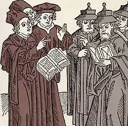 L'humanisme naissant ne s'intéresse pas non plus à leur sort. Seul Johannes Reuchlin lutte contre l'opinion commune de ses contemporains. Il soutient que l'hébreu, langue de la Bible, a une valeur spirituelle, notamment par le biais de la kabbale. C'est le premier hébraïste allemand non-juif. À son époque, Johannes Pfefferkorn, un boucher juif de Cologne converti au catholicisme, publie en 1505 sous le nom de « frère Strohmann, dominicain de Cologne » plusieurs pamphlets antisémites et exige de l'empereur Maximilien Ier un mandat pour la saisie et l'autodafé de tous les écrits des Juifs, en particulier du Talmud. Il demande aussi l'interdiction de tous les livres en hébreu. Uriel von Gemmingen, archevêque de Mayence, charge en 1510 Reuchlin d'examiner quelle influence la littérature juive avait eu sur le christianisme. Cela amène Reuchlin à entrer en conflit, par écrits interposés, avec Pfefferkorn. Reuchlin défend sa prise de position contre la destruction des livres juifs dans un livre intitulé Augenspiegel (1511). Les clercs du Saint-Empire, dans leur majorité, sont d'accord avec Reuchlin. Ce dernier doit pourtant se présenter à Rome devant l'Inquisition comme suspect d'hérésie. Le Ve concile du Latran (1512-1517) prend position en faveur de la thèse de Reuchlin, ne pouvant rien trouver dans le Talmud qui soit contraire au christianisme.