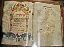 Les ateliers juifs produisent aussi de beaux manuscrits enluminés. L'enluminure des villes allemandes est caractérisée par des thèmes très variés et une iconographie d'une grande originalité : nombreux êtres hybrides, monstres, figures légendaires, tracés en traits sûrs, rehaussés de couleurs franches. Au début du XIVe siècle, deux techniques d'ornementation non figurative sont répandues : la micrographie, une écriture minuscule dont les lignes forment les contours des motifs, et le filigrane, ornement tracé à la plume, à l'encre de couleur. L'art de l'enluminure s'arrête brusquement en 1348, au moment de la Peste noire et des persécutions qui en découlent. Au XVe siècle, on produit encore des Haggadot de petit format, dont les marges sont animées de scènes bibliques enrichies d'éléments légendaires[30].