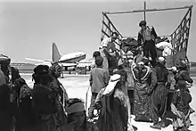 En , les Juifs « dénaturalisés » sont spoliés de tous leurs biens. Malgré une hostilité certaine d'une partie des Juifs ashkénazes envers les Juifs des pays arabes, l'État d'Israël organise alors l'opération Ezra et Néhémie par laquelle l'ensemble de la communauté irakienne d'environ 110 000 personnes se réfugie en Israël[43]. Au début, le pont aérien fut organisé entre Bagdad et Chypre mais lui succédèrent ensuite des vols entre Bagdad et l'aéroport de Lod près de Tel-Aviv. Une grande partie des Juifs irakiens dut séjourner pendant quelque temps dans les camps de réfugiés créés par Israël connus sous de le nom hébreu de ma'abarot.
