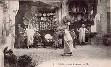 Sur le plan socio-économique, la population juive est très hétérogène. Au sein des ports du pays, les négociants juifs d'origine européenne contrôlent, avec les chrétiens, les échanges de marchandises avec l'étranger et dominent plus de la moitié des maisons de commerce exerçant dans le pays[136]. À côté de cette classe aisée de négociants et de banquiers, principalement livournais, se trouve une classe moyenne constituée de commerçants et d'artisans[137]. Ces Juifs jouent un grand rôle dans le commerce de détail, notamment dans la capitale où ils sont fortement implantés dans deux souks de la médina : celui spécialisé dans les denrées coloniales, la quincaillerie et les articles en provenance de Paris et celui spécialisé dans les draperies et les soieries anglaises et françaises[138]. Nombreux sont aussi ceux qui exercent une activité artisanale, comme le travail de l'or et de l'argent, dont ils exercent le monopole, et la confection de vêtements et de chaussures[138]. Ils servent également de prêteurs pour les paysans et les artisans[137]. Dans les régions rurales de Nabeul, Gabès et Djerba, des Juifs travaillent la vigne, le palmier-dattier ou les arbres fruitiers et pratiquent l'élevage[137].
