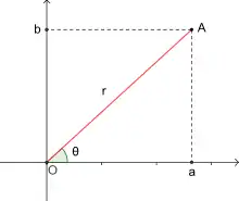 Quelques mois plus tard, dans son Mémoire sur les quantités géométriques, il reconnaît pleinement l'aspect géométrique des complexes. C'est lui qui baptise l'angle polaire de rayon OA argument de la quantité géométrique correspondante[64]. C'est également lui qui nomme affixe du point A le complexe a + i b si (a, b) sont les coordonnées de A[65].