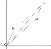 Les premières représentations des nombres complexes par des lignes dirigées sont les œuvres de deux praticiens : Caspar Wessel est un arpenteur et l'un de ses buts avoués est d'utiliser les complexes pour résoudre des triangles et manipuler des lignes possédant une longueur et une direction[31] ; quant à Jean-Robert Argand, il consacre une grande partie de son essai à montrer les intérêts pratiques de sa méthode[36]. Ils travaillent tous deux sur des lignes dirigées (on dirait aujourd'hui des vecteurs) avec une différence cependant : les lignes de Wessel ont toutes même origine alors qu'elles sont flottantes chez Argand. La somme de deux lignes dirigées se fait en utilisant la relation de Chasles et la multiplication se construit, une unité étant choisie, à l'aide de triangles semblables.