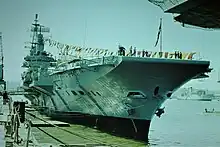 L'artillerie comportait huit affûts doubles de 114 mm[53] à double usage, en tourelles ouvertes Mark III UD, disposées en quatre groupes de deux aux angles du pont d'envol. L'artillerie de DCA rapprochée comprenait six “pom-pom” octuples, et huit affûts quadruples de mitrailleuses de 12,7 mm[54]. Cette DCA, la plus puissante de la flotte à l'époque, se justifiait par les faibles performances des avions de chasse embarqués face à l'aviation basée à terre que la Royal Navy aurait à affronter[55].