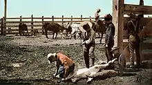 Mais ensuite, les peaux de bison ont été utilisées en Europe pour fabriquer des courroies de machines industrielles, des vêtements, et des tapis, et massivement transportées à destination de l'Europe. Pendant une décennie, à partir de 1873, il y avait plusieurs centaines, peut-être plus d'un millier, de ces équipes de « moissonneurs » de peaux. À la gare de Dodge City, à l'est du Colorado, des wagons entiers étaient remplis de peaux et envoyés vers l'est. Le déclin de la population de bison s'accélère jusqu'en 1889. Il n’existait plus en tout en Amérique du Nord que 750 bisons en 1890, du fait du braconnage. Une belle peau pouvait rapporter 3 $ à Dodge City, à une époque où un ouvrier gagnait au mieux un dollar par jour. Buffalo Bill fournissait en viande de bison (buffalo en anglais) les employés des chemins de fer Kansas Pacific Railway. Il gagna un duel contre Bill Comstock en tuant 69 bisons contre 48 en une journée[19]. De 1882 à 1912, il organise et dirige un spectacle populaire : le Buffalo Bill’s Wild West.