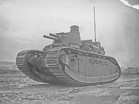 Tous ces véhicules sont testés à l'annexe de Rueil, de l'atelier de construction de Puteaux, le 13 mai 1924. Les résultats sont assez décevants, seul le train de roulement du FCM donne satisfaction. En mars de l'année suivante, le général Estienne, partant du SRA et du SRB, définit le futur char B, seul le moteur étant déplacé pour dégager un couloir d'accès aux mécanismes. Il décide d'adopter la suspension pneumatique FAMH, le train de roulement du FCM-21, porte le blindage latéral à 25 millimètres et celui du toit et du plancher à quinze. Parallèlement, il lance aussi deux autres projets, les B2 et B3, blindés à 50 millimètres, mais leur masse dépassant 55 tonnes provoque l'abandon de ces projets. Le 27 janvier 1926, il est décidé de produire trois prototypes du Char B, un assemblé par Renault, un autre par FAMH et le dernier par FCM. Les deux premiers exemplaires sont armés par le canon de 75 FAMH, le dernier embarque le canon Schneider. Les trois prototypes de char B sont regroupés en octobre 1931, au sein d'un détachement d'expérimentation. Une première commande de sept chars avec un blindage de 40 mm est finalement signée en mars 1934, avec la répartition des commandes entre les différentes sociétés. En plus de leur blindage plus épais, ces chars embarquent un nouveau canon de 75 mm, conçu par l'atelier de construction de Bourges, une nouvelle tourelle APX-1 avec un canon de 47 mm SA34, et un moteur plus puissant. Au , 34 chars lourds B1 sont en service dans l'armée française[59].