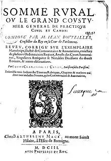 - Jean Boutillier (conseiller du Roi en sa Cour de Parlement), Somme Rural ou Le grand Coustumier Général de Practique Civil et Canon : Revu et corrigé par Louys Charondas Le Caron, Jurisconsulte Parisien, Paris, Au mont Sainct Hilaire, à l'Escu de Bretaigne, Barthelemy Macé, (lire en ligne)