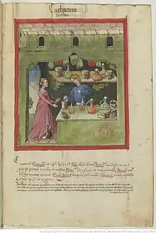 Afin d'expliquer le travail d'un apothicaire, nous prendrons l'exemple du Tacuinum sanitatis, œuvres orientale du XIe siècle écrit par Ibn Butlan, lui-même médecin et nestorien irakien. Il écrit donc le Taqwim al-Sihhah, qui voudrait dire littéralement « La préservation de la santé » qui traduit en latin donna le titre Tacuinum Sanitatis. Ses travaux traitent de l'hygiène, de la diététique ainsi que de l'exercice physique. Cette œuvre a été très populaire durant le Moyen Âge en Occident, il est pour certain considéré comme une « preuve » de l'influence de la culture arabe sur le développement de l'Europe. On connaît alors six exemplaires illustrés de ce traité. L'un d'entre eux contient des enluminures réalisées par des artistes Lombard aux XIVe et XVe siècles. Ces enluminures sont intéressantes puisque plusieurs d'entre-elles représentent la vie urbaine en Italie du Nord à la fin du Moyen Âge. En effet, le Tacuinum Sanitatis nous renseigne sur le commerce et la consommation des produits dit locaux. On représente alors déjà des scènes rurales mais aussi urbaines, nous pouvons ainsi voir le quotidien des citadins. On y voit des commerçants, on nous montre leurs boutiques : le commerce des produits alimentaires, les boucheries, les poissonniers et les poissonneries, les fromageries et échoppes de produits laitiers, Pains et céréales, les vins… puis, un commerce que l'on qualifie « d'à part » : les épiciers-apothicaires. On peut également considérer qu'en général, la fonction d'apothicaires présent dans les villes jouissent d'une situation stable, honorable et bien évidemment rémunératrice.