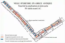 Les cités helléniques étaient généralement alimentées par des puits ou des sources, la cité d'Érétrie avait une canalisation qui partait de l'Acropole et longeait l'avenue principale afin d'aller alimenter une fontaine publique[79]. Concernant la période hellénique, de nombreuses sources archéologiques sur les jardins et leurs jeux d'eau, ainsi que sur les fontaines publiques sont disponibles ; mais il y a peu d'informations sur la nature des tuyauteries utilisées : poterie, plomb, cuivre. Les eaux après captage étaient dirigées par des aqueducs ou des tunnels, jusqu'à des citernes légèrement en hauteur. Depuis les citernes, des réseaux en poteries enterrées et en pierre, protégés au-dessus par des dalles de pierre, amenaient l'eau par gravité vers des fontaines publiques. La sortie de l'eau se faisait généralement par une tête d'animal en bronze ou mascaron[80].