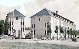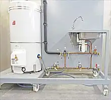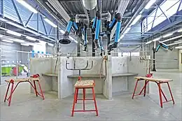 - Les hôpitaux avec les eaux froides brutes, les eaux traitées pour satisfaire la technique des appareils de soins toujours plus spécialisés, les réseaux d'eaux chaudes aux températures plus ou moins importantes, pour les besoins des chambres, cuisines et buanderies. Ce sont aussi les évacuations de ces eaux plus ou moins chargées de produits et matières polluantes diverses, qui doivent être traitées dans des stations ou des bacs de traitement, avant leur rejet dans les réseaux des égouts ou autres déversoirs[4].