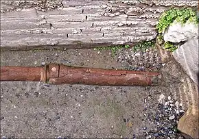 « Il est clair que c'est là l'empreinte de tube de cuivre ronds, d'environ 0,047 m (47 mm) de diamètre extérieur [...] et d'une épaisseur de 0,001 4 m (1,4 mm). Un examen plus précis a permis à certains endroits, (d, 6 et e, 5-6) de déterminer la longueur des éléments de tube à 1,02 m. Les tubes étaient emboîtés les uns dans les autres, la longueur de l'emboîture n'était pas reconnaissable. La jonction latérale (servant à l'étanchéité du tube) se faisait par un simple recouvrement de 0,026 m (26 mm) de large »