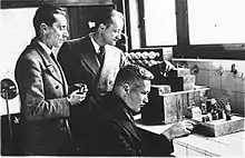 Dès , les expériences sur la libération d’énergie par réaction en chaîne commencent au laboratoire du Collège de France et se poursuivent au Laboratoire de Synthèse Atomique[alpha 2],[9],[10]. Pour asseoir ses brevets, Joliot tisse un réseau industriel autour de lui, notamment par un accord entre le CNRS et l'Union minière du Haut Katanga, détentrice de l'uranium du Congo belge[11].