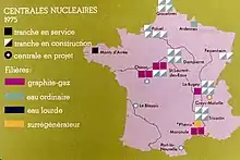 Après le succès des réacteurs expérimentaux de Marcoule, EDF est chargée de mettre en place le programme électronucléaire français avec des réacteurs du même type, Uranium naturel graphite gaz (UNGG). Pour atteindre au plus vite la compétitivité, l'entreprise publique lance des réacteurs de puissance croissante en tirant les leçons de la construction des précédents sans attendre qu'ils soient en service[85]. Ainsi, dans le but de faire baisser les coûts, les prototypes se succèdent : trois sur le site de Chinon (EDF1, EDF2 et EDF3) puis deux à Saint-Laurent-des-Eaux (EDF4 et EDF5)[86]. Le dernier prototype, à Bugey, doit amorcer une série de six centrales identiques et ouvrir la voie vers les 1 000 MWe de puissance grâce à de nouveaux types de combustibles.