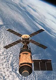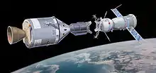 Aux États-Unis, le programme Gemini[Note 14] commença ; c'était une capsule conique biplace ressemblant à Mercury, mais plus grande, avec des écoutilles (comme pour un cockpit d'avion) et un radar (en cas de rendez-vous spatial[S 22]). À sa base se trouvaient le module de service, et le module « rétrograde » contenant des rétrofusées et permettant la sortie d'orbite pour le retour au sol. L'appareil était le premier vaisseau spatial : contrairement aux Mercury et Vostok, Gemini possédait des propulseurs de manœuvre qui lui permettaient de se mouvoir dans l'espace[C 50], et de changer d'orbite. Autre progrès, les vaisseaux Gemnini furent les premiers à utiliser la technologie des piles à combustible[C 51].