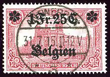 Dans le royaume occupé, la Reichspost gère le service postal du Gouvernement général de Belgique en employant les postiers belges[9]. Les timbres-poste utilisés sont des timbres d'Allemagne, principalement au type Germania surchargés de la mention en allemand « Belgien » et d'une valeur en francs belges[10].