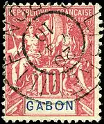 Timbre de 10 centimes de type Groupe, oblitéré à Libreville en 1910.
