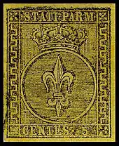 Le duché de Parme émit sa première série de timbres en 1852. Il s'agissait d'un motif constitué d'une fleur de Lys dans un cercle et surmonté de la couronne du duché.