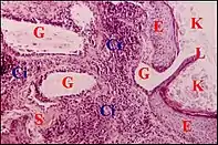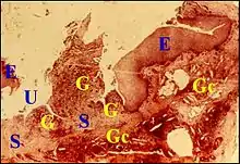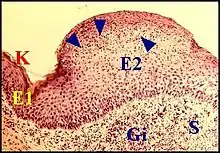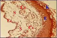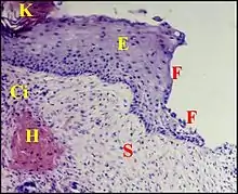 Cet épithélium, auquel d'autres auteurs réservent le nom de « matrix »[5], est formé comme par 4 strates ou couches caractéristiques comme dans un épiderme normal : le stratum basale (couche germinative, basal layer) reposant sur une lame basale ; le stratum spinosum (couche des cellules à épines, prickle cell layer ) ; le stratum granulosum (couche granuleuse, granular layer) ; le stratum corneum (couche cornée, horny layer).